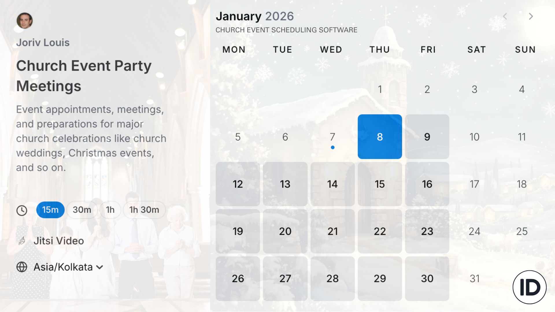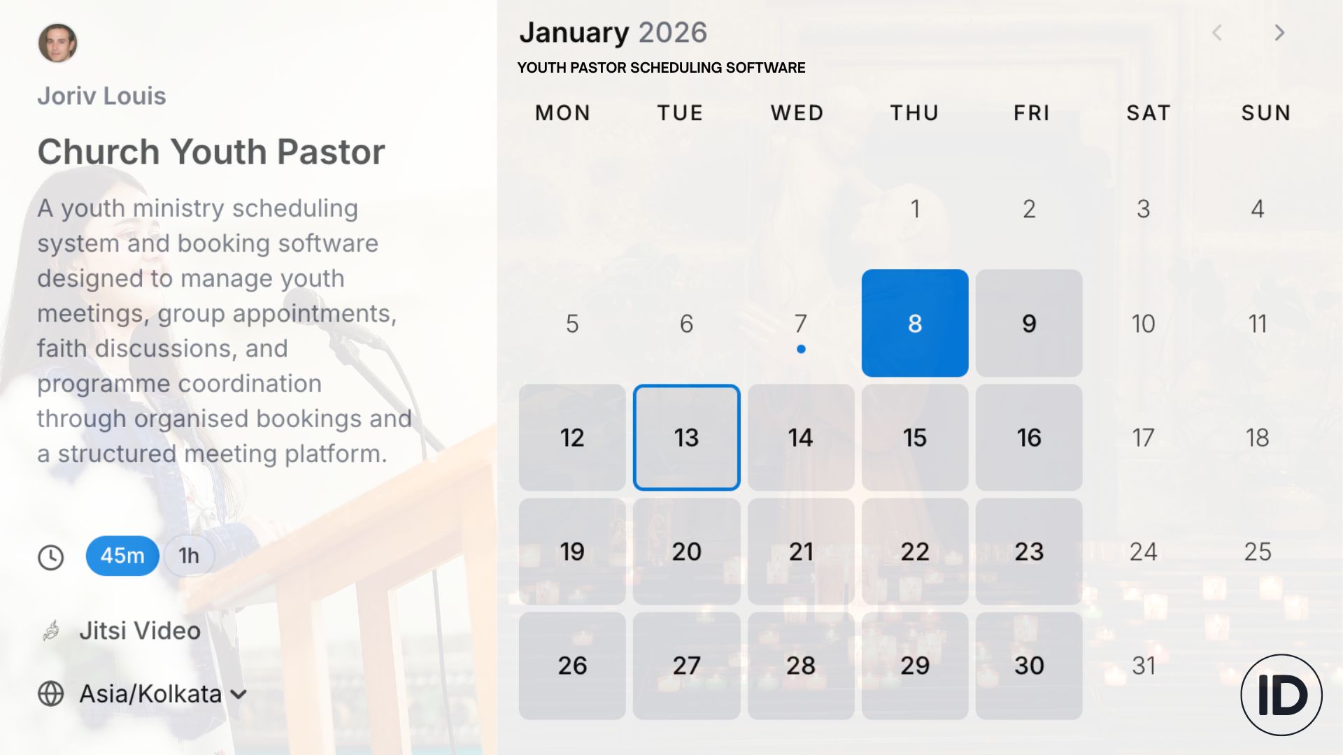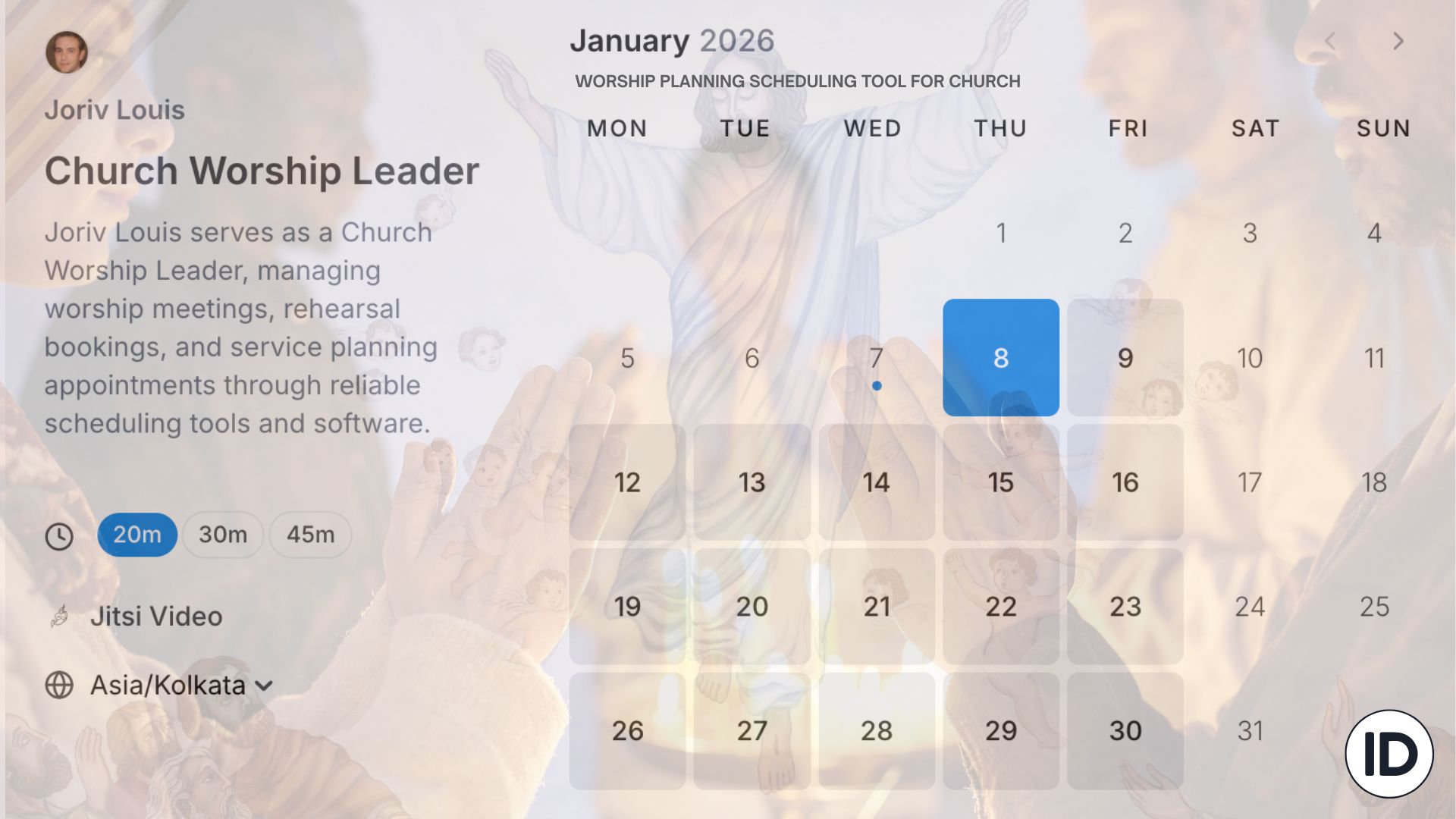 Cal ID is a free church service and event scheduling software designed to simplify worship planning, church meetings, and church ministry events, created with real church workflows in mind. This easy-to-use church scheduling tool and platform helps churches manage prayer bookings, Worshippers' appointments, and priest meetings with clear availability rules. Seat-based group bookings and automated reminders make church event management organised, reliable, and stress-free for everyone involved.