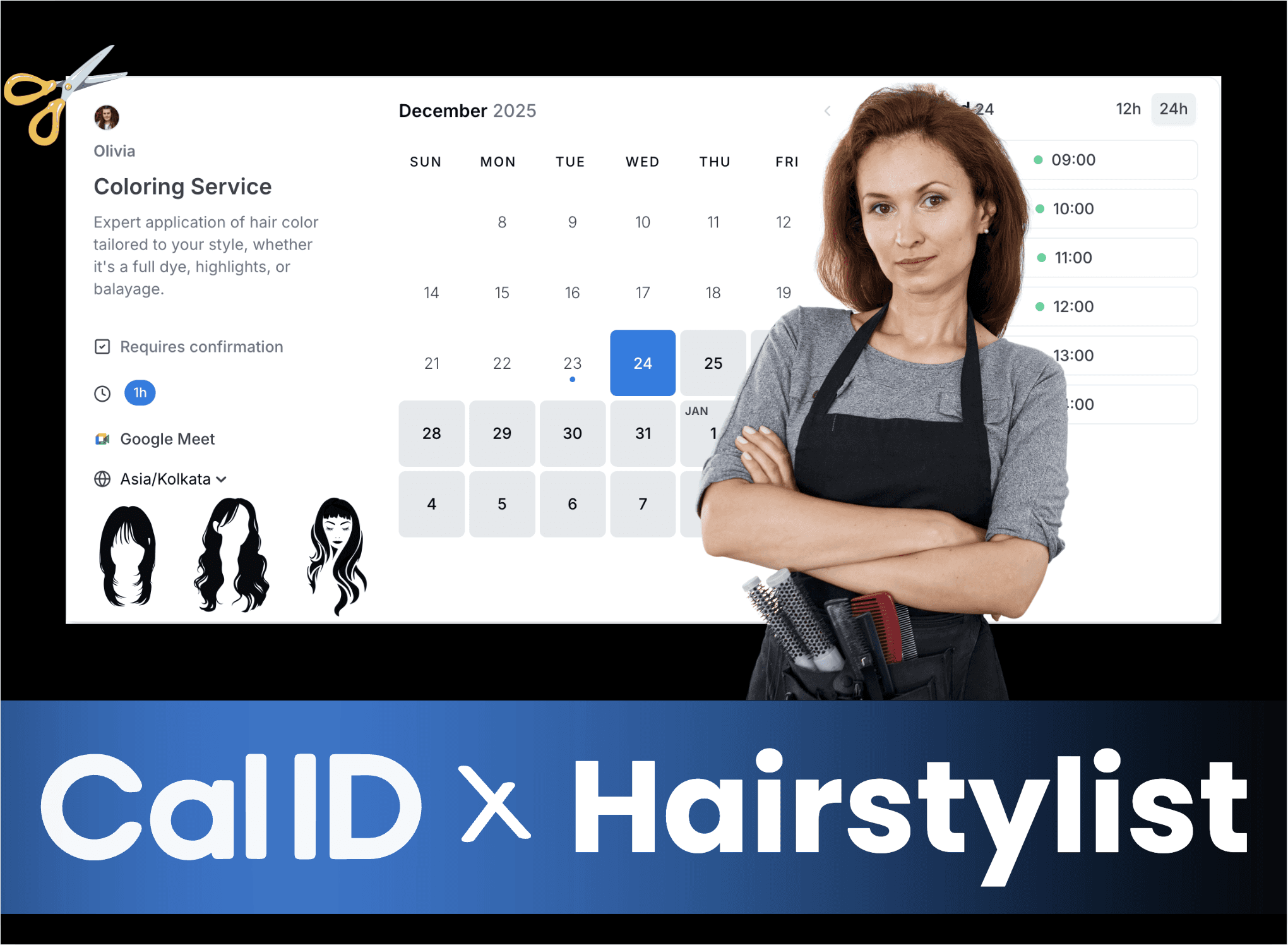 Cal ID is an easy-to-use online booking system designed to help hairstylists manage appointments smoothly. It lets your clients book services anytime, reduces no-shows with reminders and deposits, and helps you organize your daily schedule so you can focus on styling, not managing bookings.