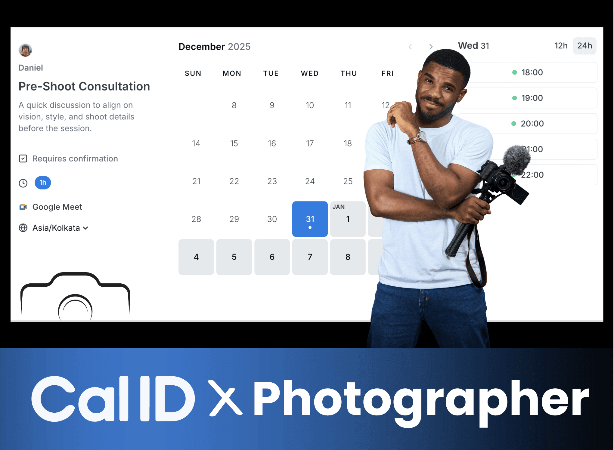 Cal ID is an online scheduling tool that helps photographers manage shoot bookings, consultations, and client meetings from a single booking link. Instead of manual coordination, clients choose available slots, share shoot details, and receive confirmations automatically.