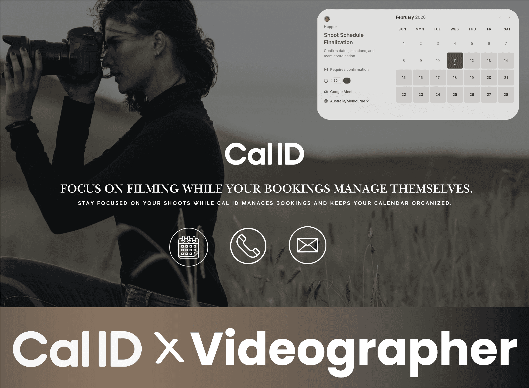 Cal ID works like a personal scheduling assistant. It manages bookings and protects shoot time so you can focus on filming.
